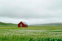 In het midden van de eindeloze groene uitgestrektheid staat een felrood huisje, alsof het een stille bewaker van de rust is. Omringd door glooiende heuvels en een zee van bloeiende weidebloemen, straalt het een gevoel van geborgenheid en afzondering uit. De lucht, bedekt met zachte grijstinten, creëert een mystieke sfeer die uitnodigt…