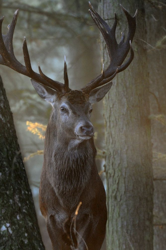 Majestic Red Deer / Rothirsch ( Cervus elaphus ) stands between trees in wonderful backlight, directly in front of the photographer, fairytale stag.