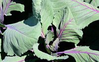 Junge Blätter des Rotkohl wachsen vor dunklem Hintergrund im Garten