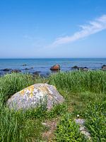 Duitsland kent net als Nederland een soort van waddeneilanden. Een van de eilanden is het prachtige en grote eiland Rügen. Op de noordelijkste punt van het eiland, Kap Arkona, staat een vuurtoren. Het strand is bezaaid met rotsen en de begroeiing loopt door tot aan het water van de zee. Het is een prachtig landschap. Voor deze foto heb ik een laag standpunt genomen, zodat de rots prominent in beeld komt. Het frisse groen van de begroeiing steekt mooi af tegen het blauw van de lucht en de zee. Het geel van de bloemen komt weer terug in de gele korstmossen op de steen.