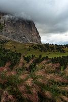 Enorme rots in de Dolomieten waarvan de top is bedekt door een dik pak wolken.
