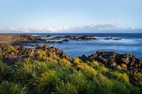 Eenzaam kustgedeelte met grote stenen blokken in het avondlicht, sterke wind beweegt grasklompjes op de voorgrond en het water, lange belichting, kleurcontrasten, dieptewerking - Ligging: Portugal, Azoren, Insel Corvo