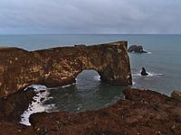 Zicht op de beroemde rotsboog op het schiereiland Dyrholaey aan de zuidkust van IJsland bij Vík í Mýrdal in het avondlicht.