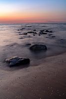 De zonsondergang bij Katwijk, waar je mooie rotsen in de zee vindt, genomen met een lange sluitertijd.