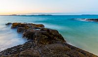 Rotsen in zee met een sluier van water door de lange sluitertijd. Het geheel geeft een zeer rustgevend beeld.