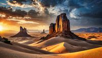 Rotsen met zand in de woestijn en zonsondergang