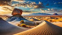 Rotsen met zand in de woestijn en zonsondergang