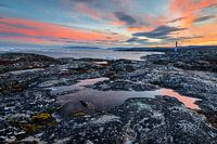 Spectaculaire zonsopkomst in een baai in Groenland. Tussen de grijs witte rotsen liggen kleine plasjes water die het oranje en roze zonlicht weerkaatsen. Het bruine mos vindt zijn weg over de rotsen en in de verte drijven ijsschotsen in de oceaan.