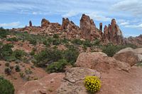 Rotsformaties in Arches National Park Utah, Amerika. Op de voorgrond gele bloemen.
