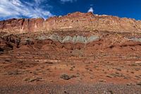 Deze enorme rotsformaties zijn indrukwekkend, de gelaagdheid in de stenen is bijzonder. De oranje kleur van het gesteente steekt extra af op de helder blauwe lucht.
