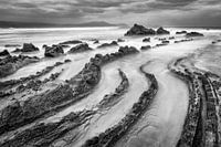 Rotskust langs de Spaanse provincie Biskaje in het noorden van Spanje. De foto is in zwart wit en toont grillige rots patronen en lijnen in het schuimende water van de zee