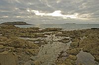 De wilde rotskust bij het Franse plaatsje Saint-Malo. Aan het einde van de dag breekt de zon nog net door de bewolking