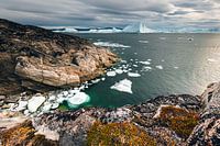 Deze baai in Ilulissat in Groenland wordt gekenmerkt door rotsformaties begroeid met mos. Het donker groene zeewater in het fjord wordt afgewisseld door kleine ijsschotsen en grote ijsbergen.