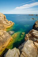 Dit is een longexposure opname van de Bretonse kust met haar imposante rotsformaties. Het water heeft diepe blauwe en groene tinten en leidt je de afbeelding in. De afbeelding heeft een staand formaat.