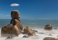 Rotsen in de zee met een klein wolkje, bewegende golven