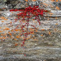 Rode rotsplant aan de oever van een riviertje in Rondane National Park, Noorwegen.