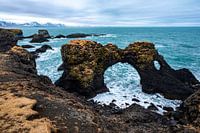 De kust van IJsland bij Arnarstapi. De rotspoort Gatklettur is een bekende rotsformatie op het schiereiland Snaefellsnes. IJslands landschapsmotief voor liefhebbers van de zee en IJsland.