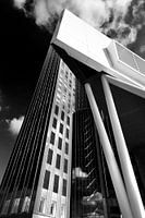 Het scheepvaarthuis in Rotterdam is vanaf de kade gefotografeerd, zodanig dat de punt van de Maastoren samenvalt met de punt van het scheepvaarthuis.