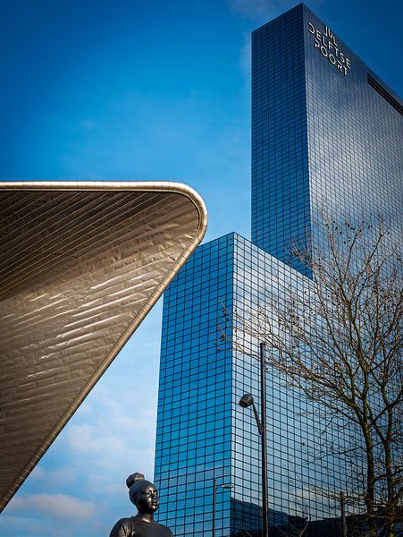 De afbeelding toont de Delftse Poort gebouw, een iconisch tweelingtorencomplex in Rotterdam. Het gebouw is gelegen naast het treinstation Rotterdam Centraal.