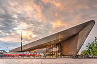 Een spectaculaire avondlucht achter de iconische vorm van het Rotterdamse Centraal Station. Dit markante bouwwerk, met zijn houten plafond en roestvrijstalen dak, werd in 2014 door Koning Willem Alexander geopend.