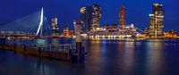 Tijdens het blauwe uurtje, stadsgezicht van Rotterdam met een cruiseschip van de Aida vloot aan de kade met natuurlijk nog de erasmusbrug.