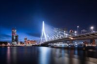 Een foto van de Rotterdamse skyline tijdens het blauwe uur.