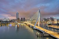 Zicht op de Erasmusbrug en de skyline van Rotterdam in de vroege ochtend. De beginnende zonsondergang wordt in de kiem gesmoord door een aankomende regenbui. Even is er wat kleur in de lucht voordat het begint te regenen en het uitzicht vervaagt.