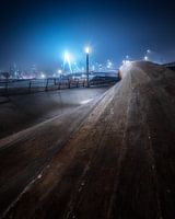Een avondopname van de skyline van Rotterdam met de Erasmusbrug in de mist. De Erasmusbrug is naast de Willemsbrug de tweede brug over de Nieuwe Maas in het centrum van Rotterdam in de Haven van Rotterdam en is vernoemd naar de Nederlandse priester en humanist Erasmus. De brug verbindt de wijk Kop van Zuid met het centrum aan de noordzijde van de rivier.