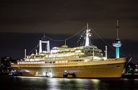 Rotterdam harbor at night i came across this ship that was dockt. In the background is the Euromast restorant I took this picture with a long exposure for a misty look and a chance for soft bright lights around the ship..