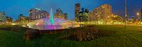 Een panoramafoto van de hofplein fontein vroeg in de avond. Aan de linkerkant is nog net het staduis te zien.