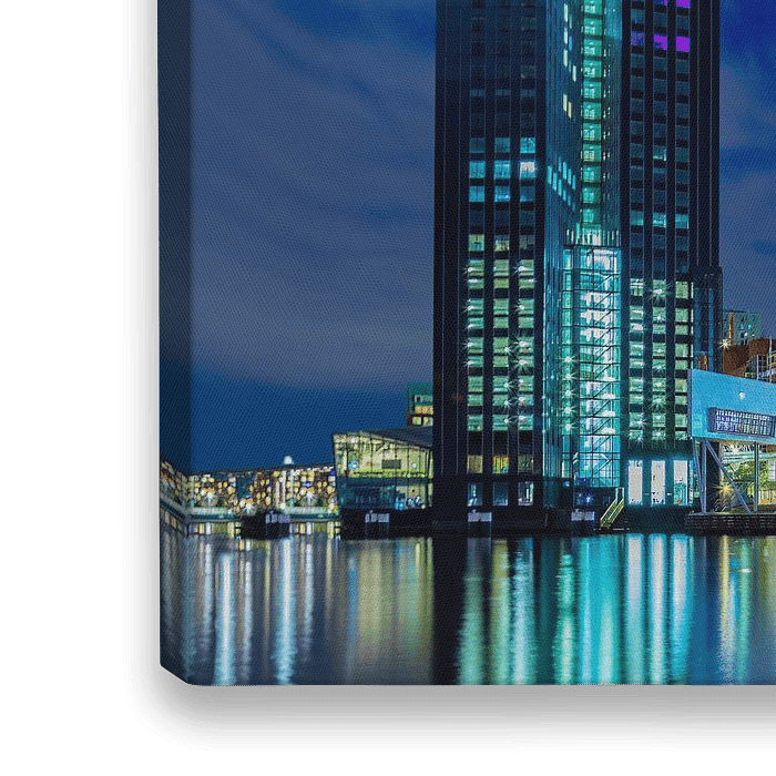 Wie 's avonds een wandeling door de binnenstad van Rotterdam maakt, zal van alle kanten omringt worden door de schoonheid van de gebouwen en daarbij voelt de stad sprookjesachtig aan.