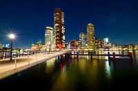 Rotterdam 's avonds op de Kop van Zuid bij de Rijnhaven. Verschillende gebouwen staan hoog in de nacht, waaronder het oude Hotel New York, het World Port Center, Montevideo en New Orleans gebouwen. De naam "Kop van Zuid" betekent "Kop van Zuid," verwijzend naar de positie als het zuidelijke puntje van de stad, direct aan de oever van de Nieuwe Maas. Dit gebied heeft de afgelopen decennia een aanzienlijke herontwikkeling ondergaan, waardoor het is veranderd van een industrieel havengebied in een bruisend centrum van bedrijven, cultuur en woningen. De Kop van Zuid is een symbool van Rotterdam's naoorlogse wederopbouw en transformatie, een mix van moderne architectuur, cultuur en een sterke band met de maritieme geschiedenis van de stad's.