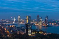 De skyline van rotterdam met de kop van zuid in het blauwe uur gefotografeerd vanaf de euromast.