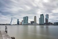 Fantastische foto van de skyline in Rotterdam van de Kop van Zuid. Foto gemaakt met lange sluitertijd zodat de lijnen van de wolkenkrabbers mooi strak zijn in het water en de lucht mooi zacht.