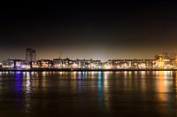 Een sfeervolle en kleurrijke nachtfoto van Rotterdamse herenhuizen aan de Maaskade op het Noordereiland opeen mistige avond. Deze avondfoto toont kleur- en contrastrijke stadslichten die op mooie wijze reflecteren in het water van de Nieuwe Maas. Links in beeld ziet je de iconische brug 'De Hef'. De statige huizen op deze panoramafoto staan tussen de Willemsbrug en de Erasmusbrug in Rotterdam.