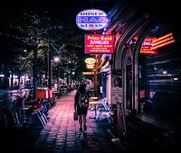 De Kruiskade in Rotterdam belicht door felle neon verlichten dat weerkaatst op de natte straten na een regenbui.