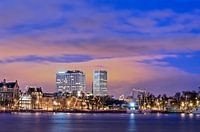 Het blauwe uur in Rotterdam op een ochtend in januari, gezien vanaf de Wilhelminapier. Op de voorgrond de Nieuwe Maas, aan de overkant de Wester- en Willemskade en de Veerhaven. Op de achtergrond de torens van het Erasmus MC.