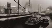 Rotterdam Oude Haven in de mist op een vroege ochtend in sfeervol zwart wit met een tintje.