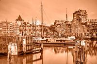 Een monochroombeeld van de Oude Haven in Rotterdam op een windstille winterochtend, met dukdalven en historische binnenvaartschepen en op de achtergrond onder andere het Potlood, de Kubuswoningen en de Apenrots.