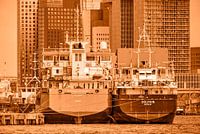 Een monochroombeeld met aangemeerde zeeschepen bij de Parkkade in Rotterdam, met op de achtergrond de moderne hoogbouw op de Wilhelminapier