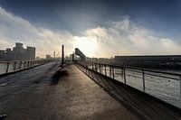 Rotterdam Rijnhavenbrug (bijnaam de Hoerenloper) in de ochtend met opkomend zonnetje in de mist.