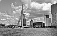 Een zwart wit foto van de erasmusbrug aan de kop van zuid, die ik maakte in Rotterdam.