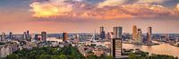 Prachtige panorama van de skyline van Rotterdam, de foto is genomen vanaf de Euromast tijdens de zonsondergang. Vlak er voor trok er nog een flinke onweersbui over de stad heen, waarvan er gelukkig nog een aantal mooie wolkenpartijen van de zien zijn. Deze panorama heeft een verhouding van 3:1 en is uitermate geschikt voor grote prints, dit vanwege de grote resolutie van de foto. Dus zelfs bij hele grote prints blijft de kwaliteit gewaarborgd en wordt het beeld niet 'pixelachtig' Met andere woorden een super aanwinst om aan groot aan je muur te hebben hangen.