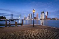 Een foto van de Rotterdamse skyline tijdens het blauwe uur. Genomen vanaf de Veerhaven.