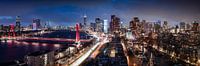 Uitzicht op de Rotterdamse skyline, met zicht op onder andere op de Willemsbrug, het Witte Huis en de Markthal.