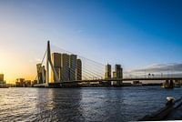 Deze foto heet "Rotterdam Skyline in the morning" en toont je de skyline van Kop van Zuid met de Erasmusbrug, De Rotterdam, de Boston & Seattle woontorens, Montevideo, Port of Rotterdam en Hotel New York.