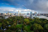De Rotterdamse Skyline onder een prachtige regenboog. Zichtbaar zijn onder andere de Erasmusbrug, het Park, de Zalmhaventoren en de Wilhelminapier
