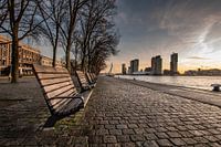 Rotterdam Skyline zonsopkomst met uitzicht op Wilheminapier. Wilhelminakade (ook wel de kop van zuid genoemd), Mooie blauwe lucht, met zonsopkomst en brandende verlichting in de wolkenkrabbers. Het water wat je ziet is de Nieuwe Maas In de achtergodn vind je ook nog de erasmusbrug