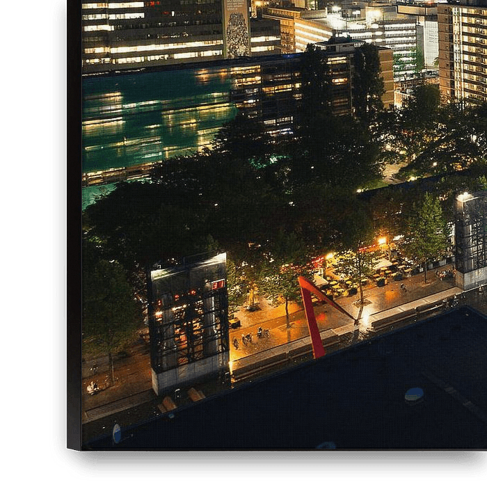 Het centrum van Rotterdam in de avond, met op de voorgrond het Schouwburgplein.