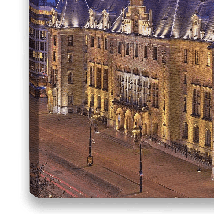 Een zeer hoge resolutie (80Mp) opname van van het stadhuis van Rotterdam vroeg in de avond. Op een grote vergroting kun je bijzonder veel details verwachten die hier in het klein verborgen blijven.